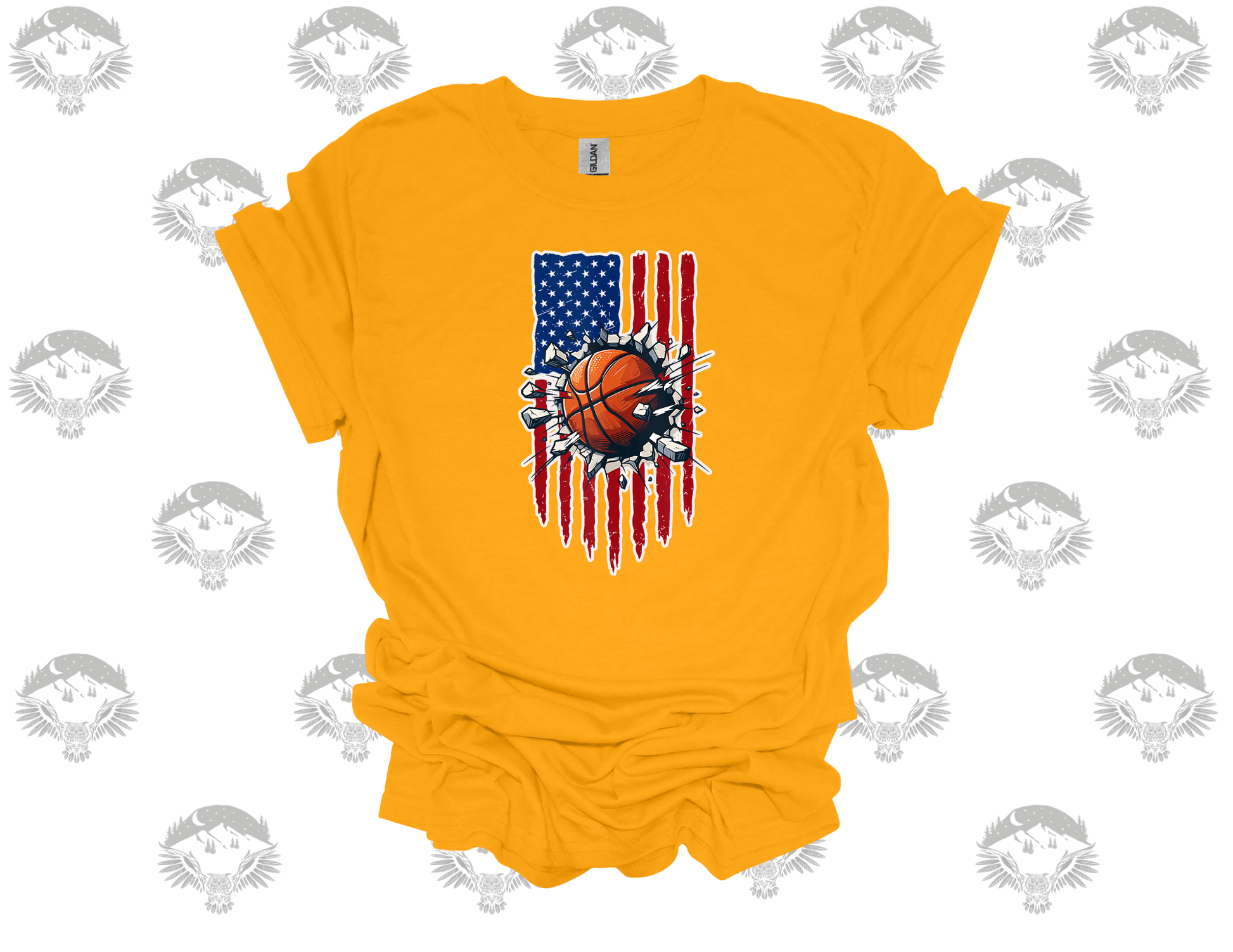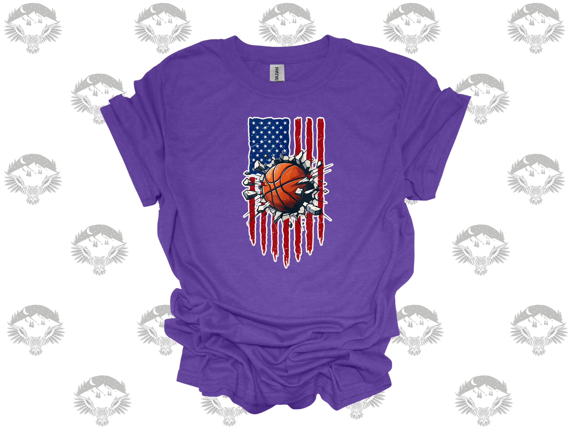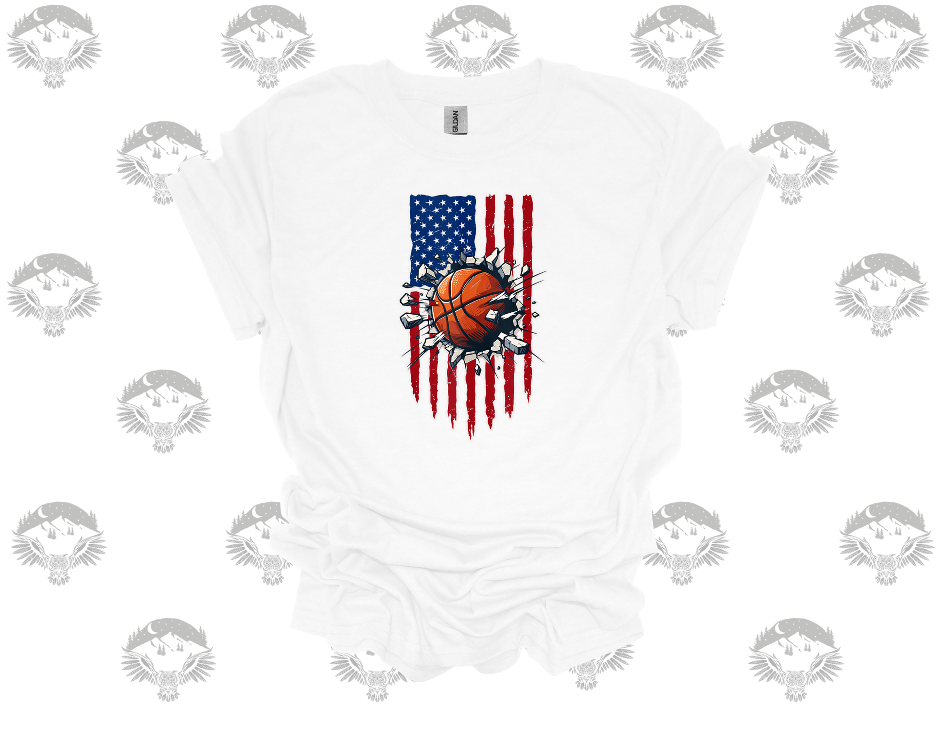 Proud of your game and your country? This tee features a bold American flag graphic with a basketball bursting through — the perfect blend of patriotism and court pride. Soft, comfortable, and ready for game days, tournaments, or everyday wear.