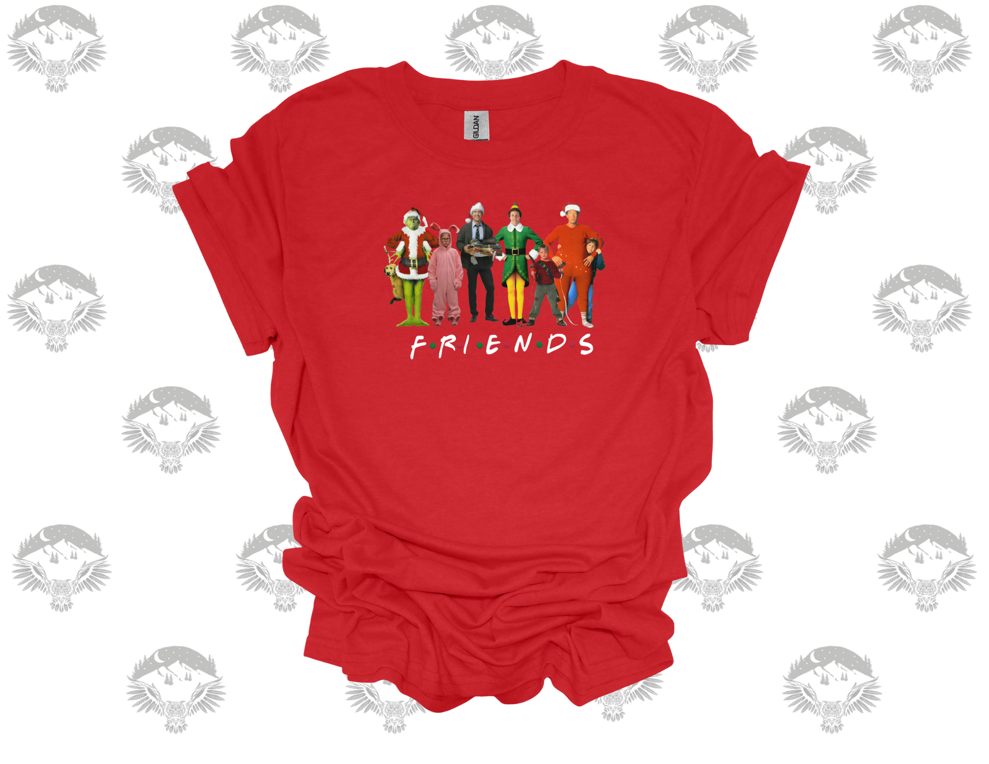 Bring your favorite holiday misfits together in one festive tee! This fun Gildan Softstyle t-shirt features a FRIENDS-inspired decal with all the iconic Christmas movie characters you love: Buddy the Elf, The Grinch, Ralphie, and Santa Claus. Perfect for movie buffs, pop culture fans, or anyone who loves a little holiday nostalgia. Available in sizes Small through 2XL and colors Black, Grey, Red, and Green, this high-quality t-shirt is ideal for holiday parties, cozy nights in, or as a gift for the movie lover in your life. Show off your holiday spirit—FRIENDS style!