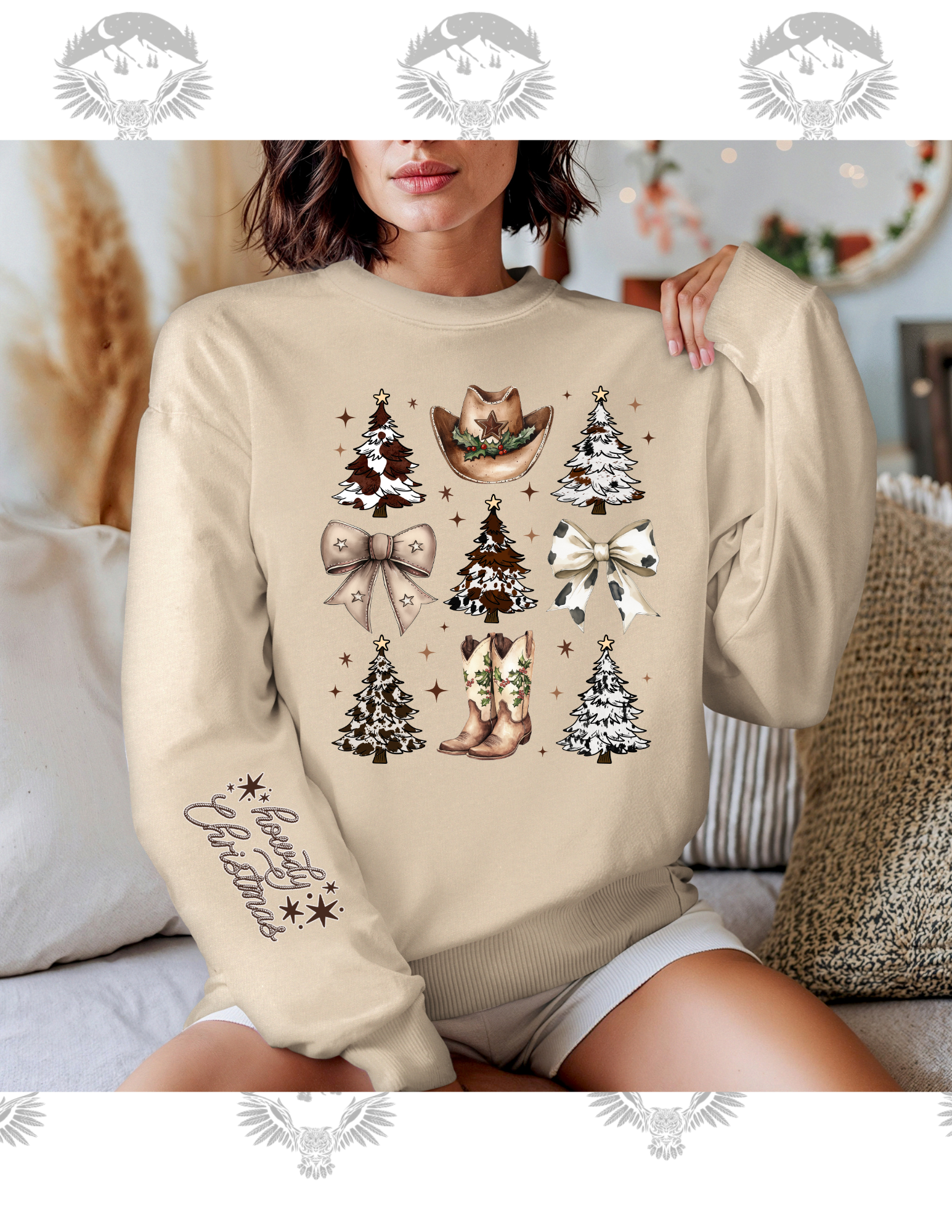 Celebrate the holidays with a touch of western charm in our Howdy Christmas crewneck sweatshirt! Featuring cowboy boots, Christmas trees, and festive western bows, with “Howdy Christmas” printed on the sleeve, this sweatshirt is perfect for bringing a little country cheer to your holiday season.