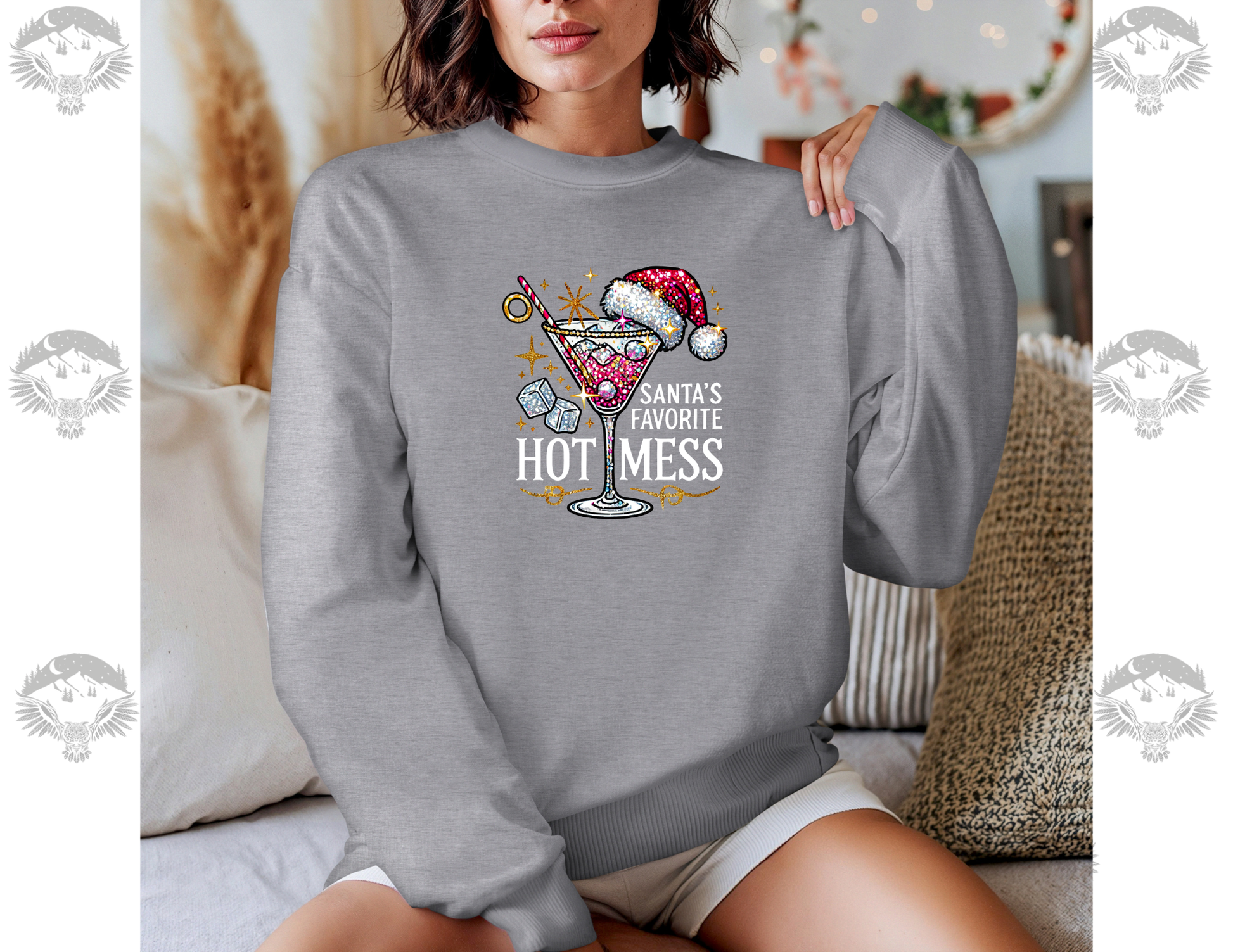 Bring the holiday cheer (and a little sass) with our Santa’s Favorite Hot Mess crewneck! Featuring a glittery martini glass topped with a Santa hat, this fun and festive design is perfect for holiday parties, girls’ nights, or anyone who loves to sparkle through the season.